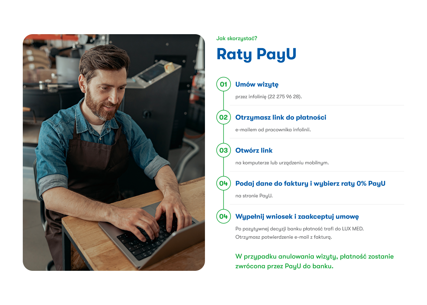 W LUX MED jest możliwość sfinansowania Twojego leczenia za pośrednictwem kredytu (przy zawarciu którego pośredniczy PayU) zwanego Raty PayU.