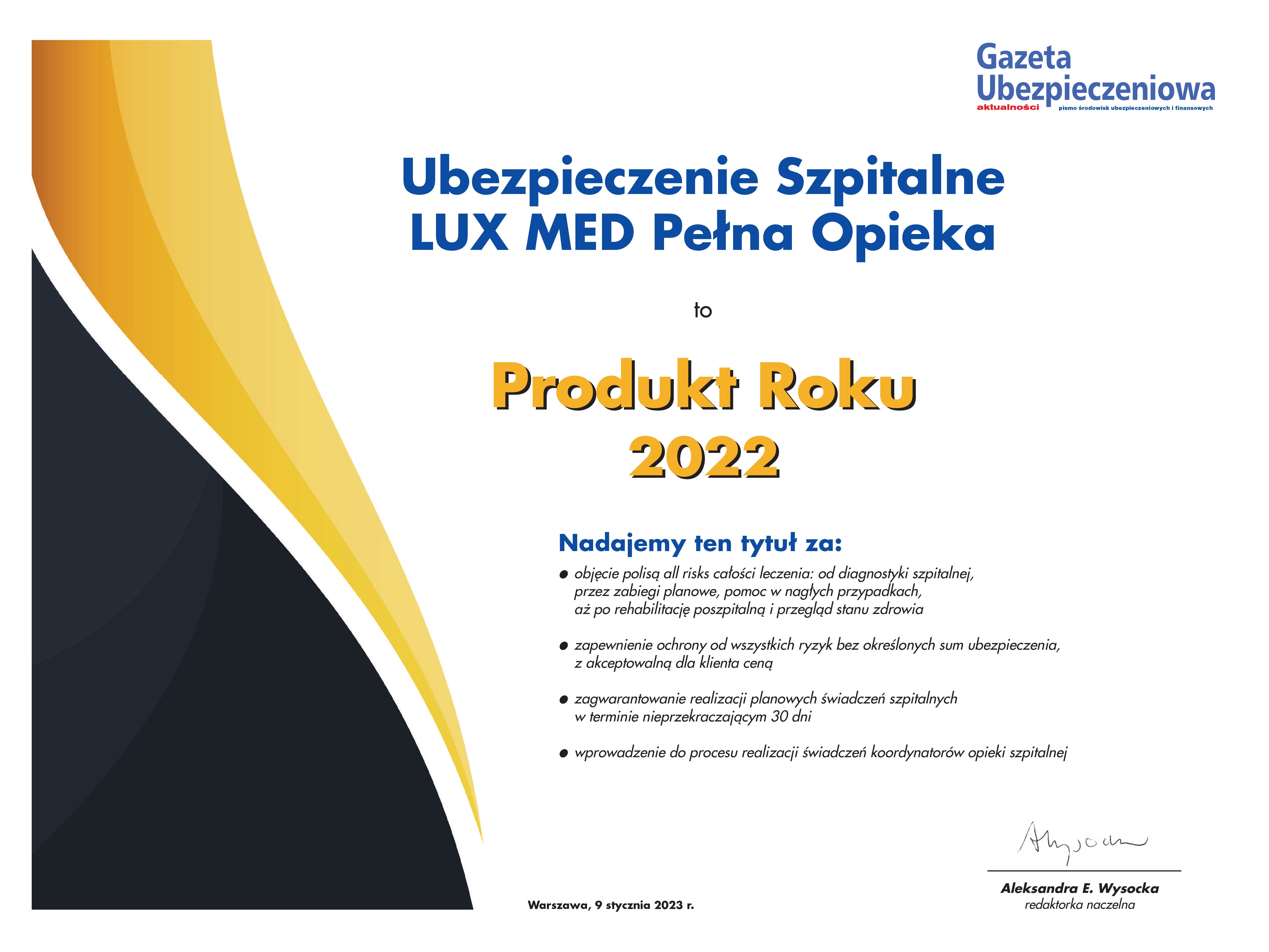 Ubezpieczenie szpitalne LUX MED Pełna Opieka zdobyło tytuł „Produkt Roku 2022” Gazety Ubezpieczeniowej!