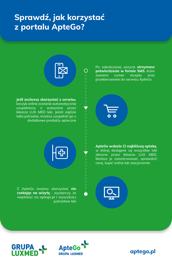 Po wizycie u lekarza w LUX MED dostaniesz SMS z linkiem do naszego serwisu, w którym znajdziesz gotowy koszyk z lekami, które zostały Ci przepisane przez lekarza. Ich listę możesz dowolnie uzupełnić o inne potrzebne Ci produkty apteczne. Z listy aptek w wybranej przez Ciebie lokalizacji pokażemy te, w których dostępne są Twoje leki. Produkty ze swojego koszyka możesz zarezerwować i dokonać zakupu stacjonarnie lub kupić online, a także sprawdzić ich cenę.