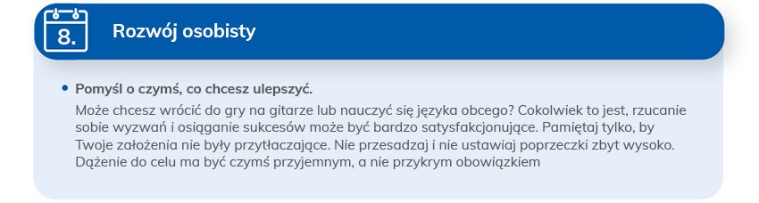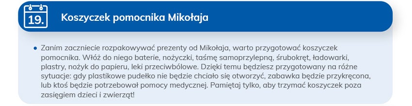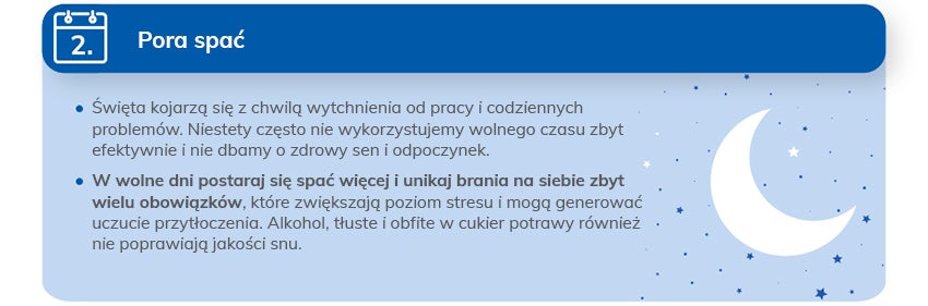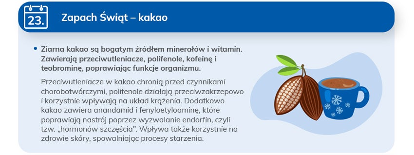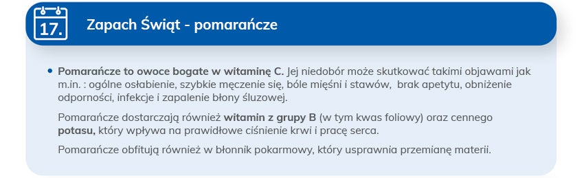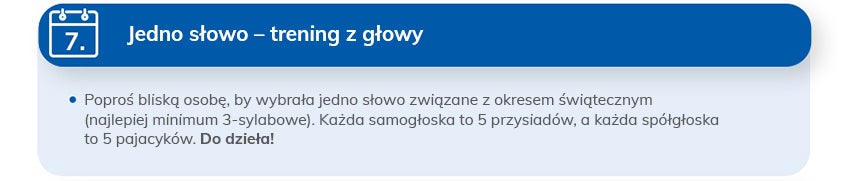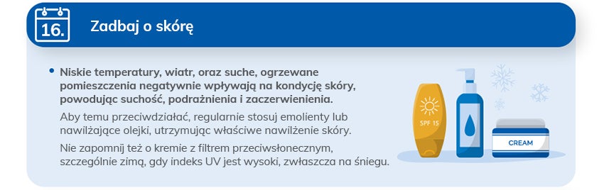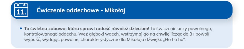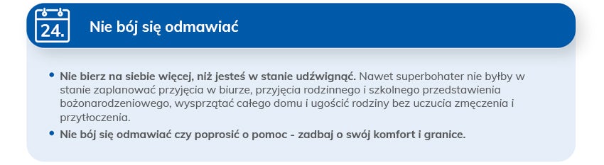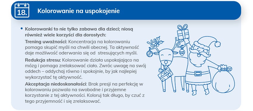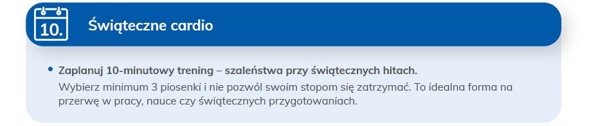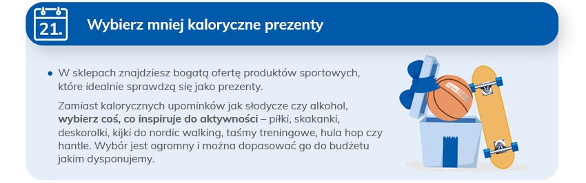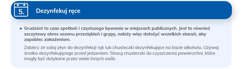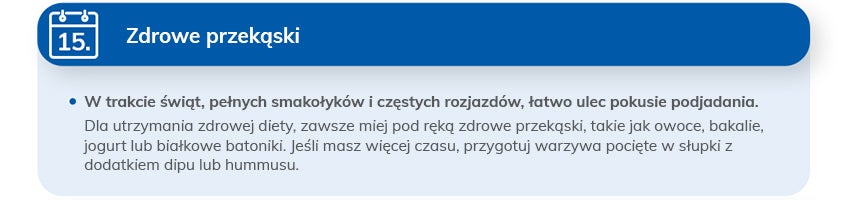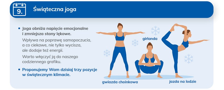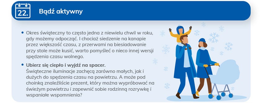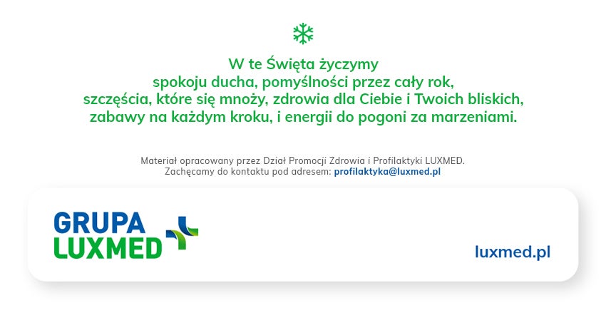 Czas zacząć grudniowe odliczanie do świąt! W tym roku spróbuj zadbać nie tylko o najbliższych, ale i o siebie. W naszym kalendarzu „Po zdrowie z LUX MED” znajdziesz porcję wskazówek i rad na każdy dzień aż do Wigilii. Dzięki nim poprawisz swoje samopoczucie i zdrowo spędzisz ten wyjątkowy czas.