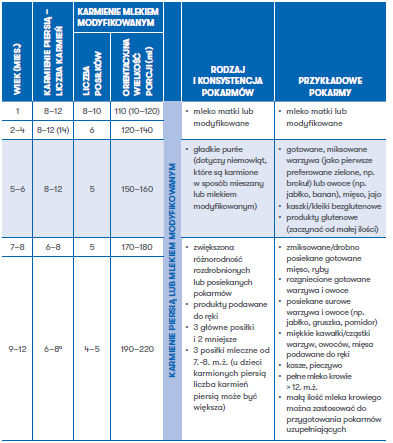 Niemowlęta powinny być karmione wyłącznie pokarmem kobiecym przez pierwszych 6 miesięcy życia (co najmniej przez pełne 4 mies.). Nie należy podawać innych płynów (np. wody, soków, mleka modyfikowanego). Wyjątek stanowią witaminy lub leki.. U niektórych niemowląt (np. z dużym zapotrzebowaniem na żelazo) korzystne może być wcześniejsze wprowadzenie pokarmów uzupełniających. o ukończeniu 12 miesiąca życia karmienie piersią powinno być kontynuowane tak długo, jak będzie to pożądane przez matkę i dziecko. W tym czasie wskazane jest podawanie pokarmów uzupełniających.