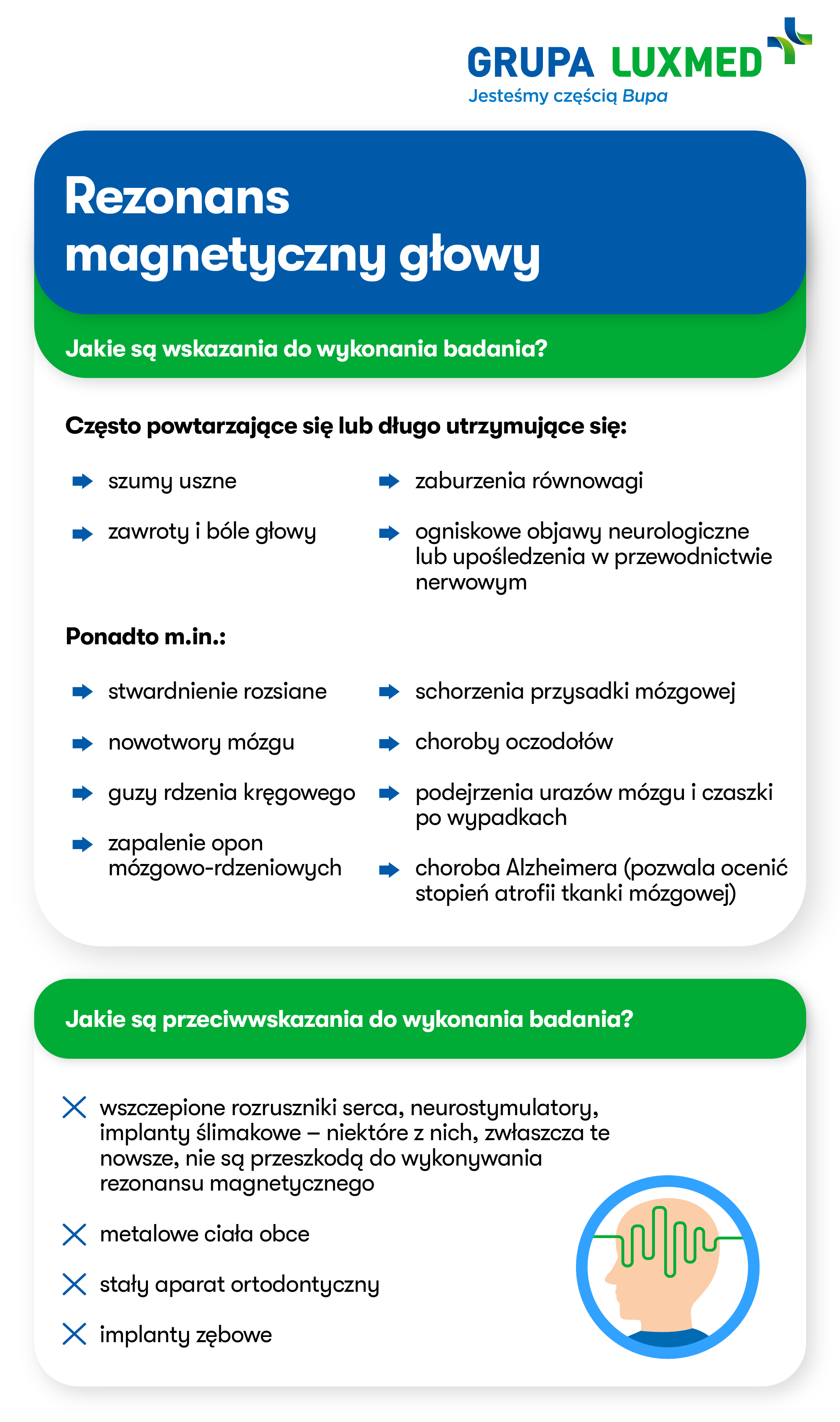 Wskazaniami do wykonania rezonansu magnetycznego głowy są m.in.: