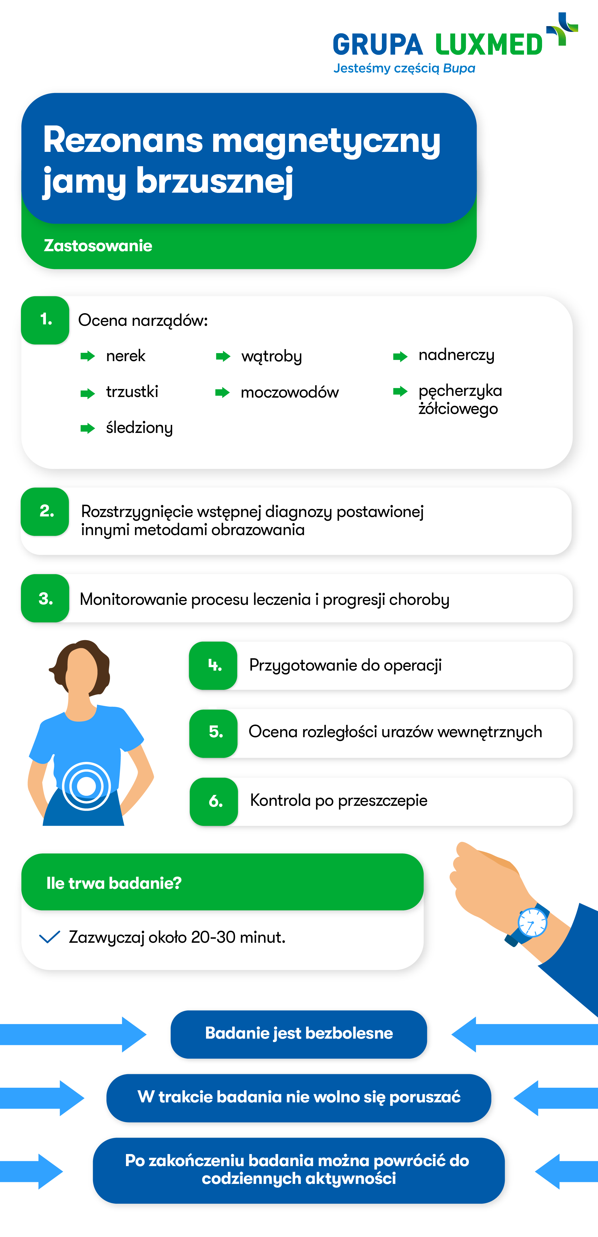 Rezonans jamy brzusznej pozwala diagnozować nieprawidłowości, lecz używa się go również do monitorowania procesu leczenia i progresji choroby, przygotowania do operacji, oceny rozległości urazów wewnętrznych czy do kontroli po przeszczepie.