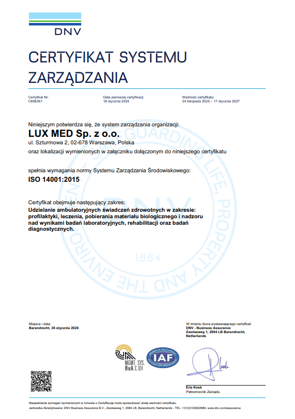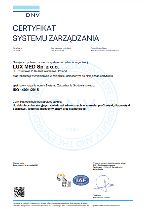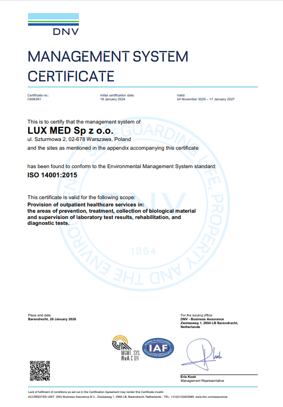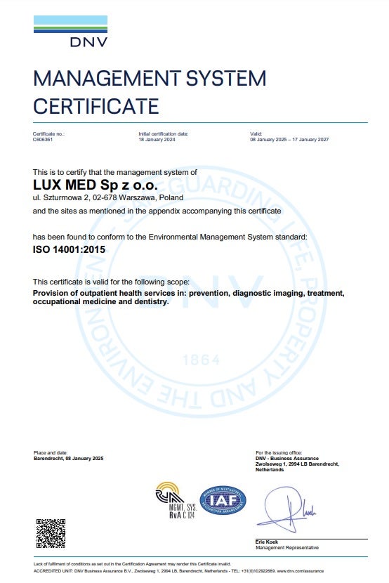 Certyfikat ISO14001 LUX MED sp. z o.o. – wersja polska