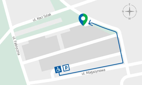 Pacjenci LUX MED mogą korzystać z bezpłatnych, oznakowanych miejsc parkingowych. Wjazd znajduje się od ul. Magazynowej. Miejsce parkingowe dla osoby z niepełnosprawnością znajduje się na wprost drogą wewnętrzną po lewej stronie (zgodnie z oznakowaniem). Z tego miejsca można bez barierowo dotrzeć do centrum medycznego.